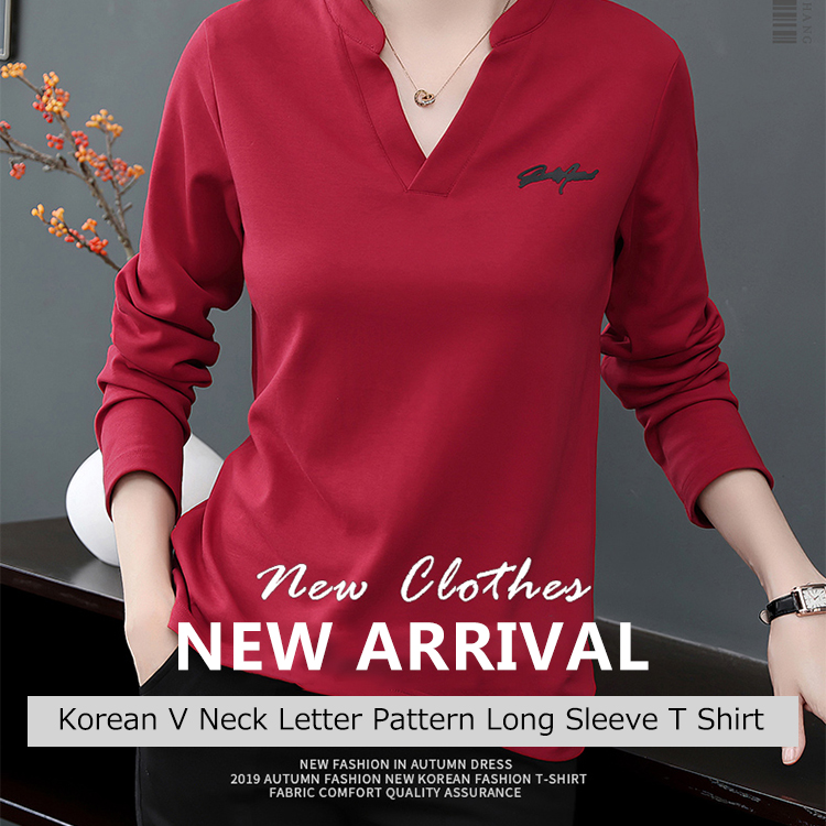 Korean V Neck Letter Pattern Long Sleeve T Shirt